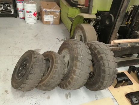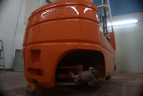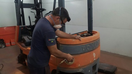 Una vez revisados y reparados todos los componentes e instalación electrica se procede al lijado completo de la carretilla. Primero se lija con una máquina orbital en seco, se asea y se desengrasa. Luego se prepara la masilla y se aplica las capas necesarias, una o máximo dos capas. Se deja secar y se lija también en seco.
