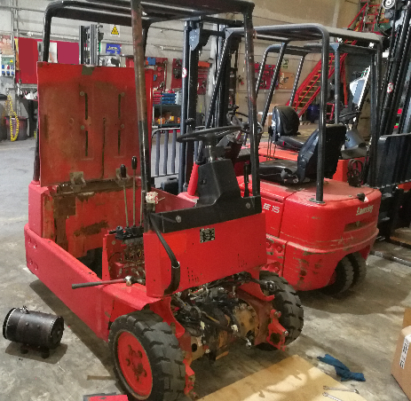 Una vez revisada se procede al desmontaje del mástil, contrapeso, tejadillo, asiento, ruedas, capo, recambios y todas las piezas electrónicas que puedan verse dañadas por el agua a presión para su posterior limpieza.